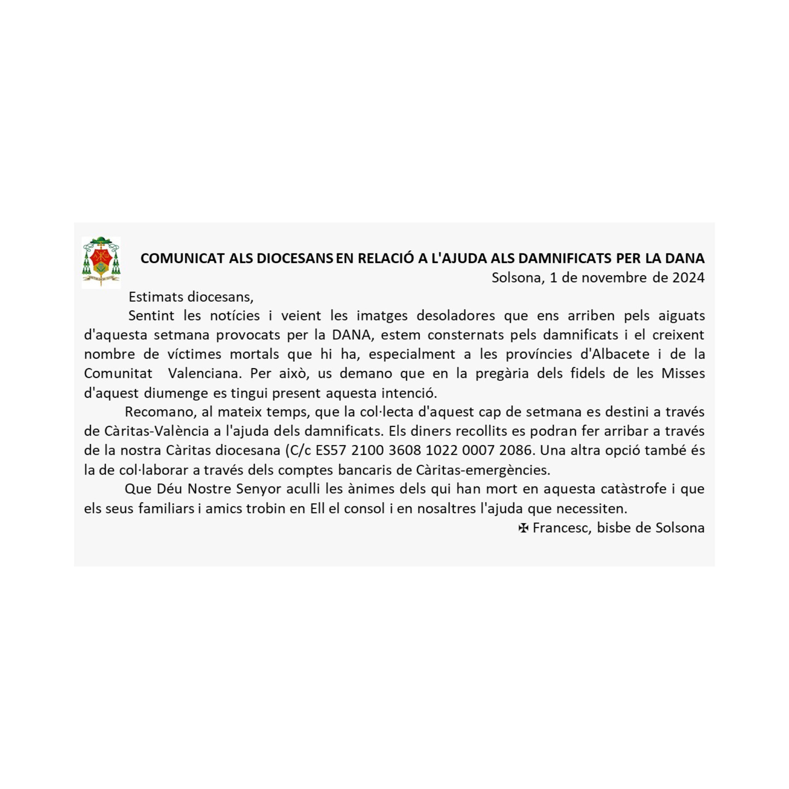 Carta d’agraïment del Sr. Bisbe referent a la col·lecta per la DANA 14 de desembre de 2024 per immatoni