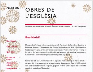 La cornisa està formada per llistons superposats seguint un sentit volumètric de més petit a més gran. Al damunt se situa un cos exempt en forma de copa coronat amb un motiu vegetal. Damunt la cornisa sorgeix l’arc de mig punt que uneix les columnes de cada costat. Aquest arc empara una capelleta buida que se situa a la part que correspondria al timpà sota la qual hi ha una inscripció (1862). A cada banda del frontis una forma circular en baix relleu decora el pany de paret. Formada per una òcul cec, emmarcat per dues circumferències concèntriques, l’última de les quals en la seva part superior s’obre per donar pas a una forma de petxina mentre que la part inferior del cercle es cargola en forma de flor de llis invertida. La portalada dóna sensació volumètrica pel joc de volums sobresortints de les quatre columnes. Pica baptismal de pedra consistent en una base cilíndrica llisa i en un vas semicircular on es concentra tota la decoració. Presenta la vora superior perfilada amb una sanefa de triangles capicuats al centre dels quals sobresurt una boleta.