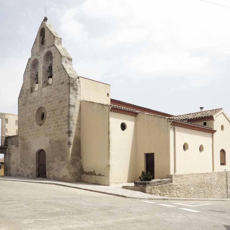 L’església parroquial de Santa Maria, edifici d’origen romànic reformat el segle xv, amb façana simple de portal adovellat i campanar de paret amb tres obertures, dins d’una línia que recorda la dels Alamús. Es destaca l’antic casal dels senyors del poble, ara d’ús particular. La població ha crescut vers el ferrocarril i la carretera i forma en un petit sector gairebé un continu urbà amb la ciutat de Mollerussa, a la zona on es localitzen algunes de les indústries. Als afores hi ha la capella votiva de Sant Sebastià, petit edifici d’una nau.