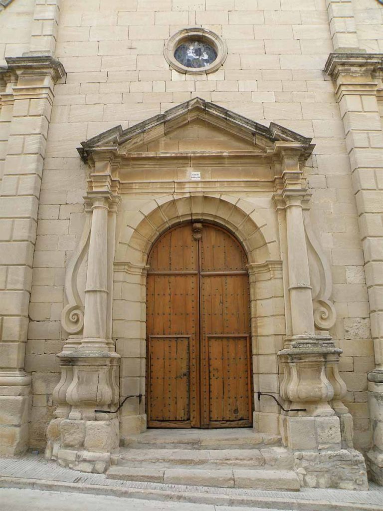 El frontis de l’església: La porta principal presenta forma de templet, amb columnes d’estil dòric emmarcades per volutes a l’exterior i sostenint un timpà triangular amb el fris llis que sobresurt als extrems en correspondència amb els elements sustentats. Aquests recolzen sobre una complexa basa formada per un toro i una prominent escòcia, la qual es conjuga amb corbes còncaves i convexes.