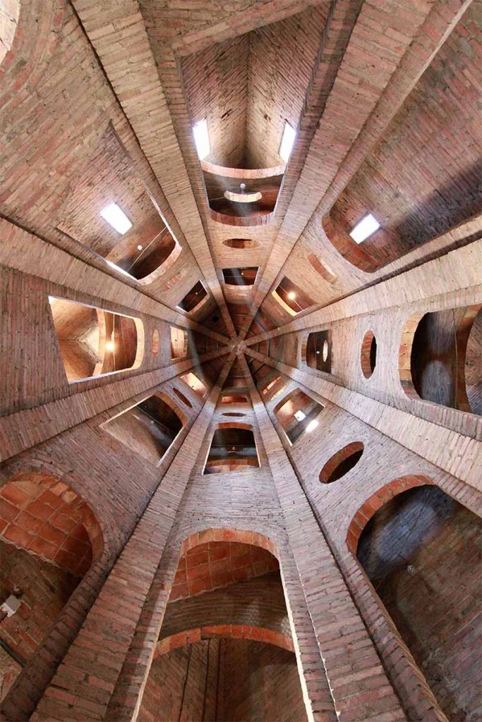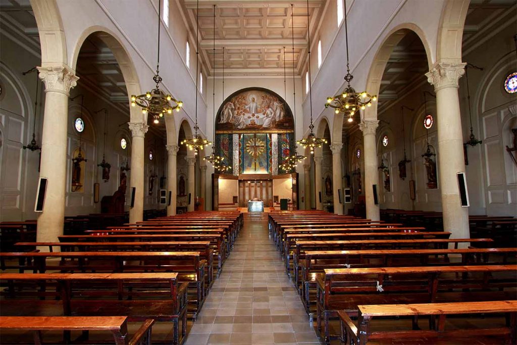 La nau central, amb una diferència d’altura acusada respecte a les laterals, està formada per tres nivells; el primer nivell arriba fins a l’acabament dels arcs; el segon nivell neix amb un llistó i arriba fins al tercer, el qual està emmarcat per les finestres de mig punt que són l’única entrada de llum, a part dels rosetons del frontis.[1] El sostre de les naus, dividit per set registres que emmarquen estructures quadrades, cerca la imitació de l’enteixinat. A la nau central actualment no hi ha absis; modificat cap als volts de 1970 es va tancar amb la construcció del nou altar major; la part absidal va quedar amb funció de capella i sagristia. L’absis estava concebut en el seu sentit més estricte: mitja circumferència, de notables proporcions, tancat per l’altar; l’actual és una composició moderna basada en la barreja de la vidriera, el mosaic i la pintura; aquesta última disciplina, situada al timpà representa el Sant Sopar, l’autor del qual és en Gorgues Gou.