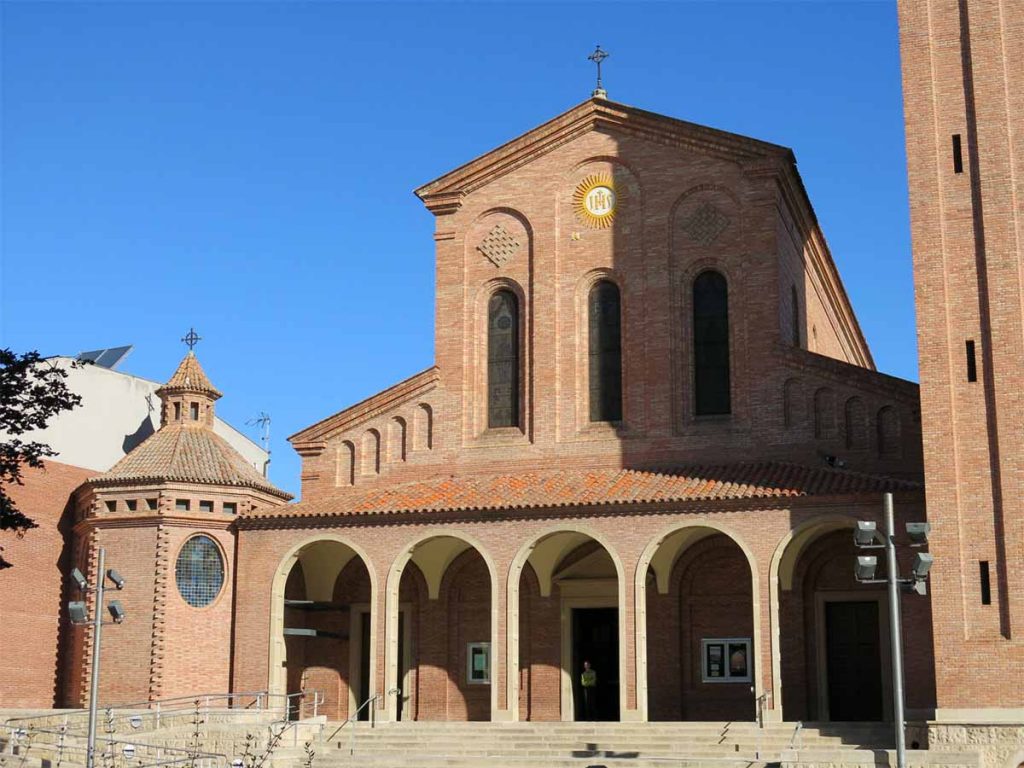 A tot el conjunt s’hi accedeix mitjançant una escalinata. El cos central presenta a la part inferior un atri porticat amb cinc arcades. Dins d’aquest hi ha tres portes, la central coronada per un frontó. La part superior de l’edifici central va decorada amb arcuacions que emmarquen els finestrals. El campanar segueix la decoració de les arcuacions i dels arcs cecs. Tot el conjunt és realitzat amb maó, material que l’hi dóna un aire de lleugeresa.